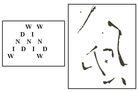 И тут неминуемо встает вопрос о самоценности знака и знаковой системы в формировании зрительного образа произведения. Несмотря на то, что в западной традиции это была прерогатива авангардного искусства, истоки знаковой поэзии мы находим в традиции восточной каллиграфии, например, в японской конкретной поэзии. Японский иероглиф изображает то, что означает. Сравним, например, визуальное произведение О. Гомрингера «Ветер» (слева) с одноименным произведением Яманака Рихоиро. То, что с таким трудом пытался выразить немец (хотя с большой натяжкой его WIND дает ощущение ветра), удается японцу с такой какой-то врожденной красотой и грацией, что кажется, он просто играет. И действительно, простые манипуляции с иероглифами или просто иероглифы в определенном художественном сочетании, настолько зримо и динамично изображают свое значение, что вызывают лишь немое восхищение. Быть может, поэтому в Японии с такой серьезностью относились именно к зрительному воплощению речи. Сэй Сёнагон сообщает, что в Японии любовник, вернувшись со свидания, должен был немедленно написать возлюбленной о своем впечатлении от встречи, а она должна была ему немедля ответить. Почему же они не могли сказать это друг другу перед расставанием? Слово-иероглиф мало произнести, его нужно увидеть. В манере японской каллиграфии очень важен индивидуальный подход. Ведь то, как ты рисуешь иероглиф, отображает твое настроение, твое эмоциональное состояние на момент письма и, естественно, является частью твоего творческого акта. В эпоху тотальной компьютеризации, когда каллиграфия вышла из моды и давно была заменена печатным текстом, традиция рисования японских иероглифов перешла в визуальную поэзию. Соединив в себе как визуальное, так и звуковое начало, эта традиция, адаптированная в современном искусстве, привела к произведениям, в которых знаковость «всецело работает на произнесение, не теряя при этом своего визуального достоинства» [20: 248].